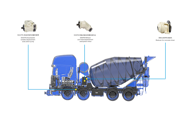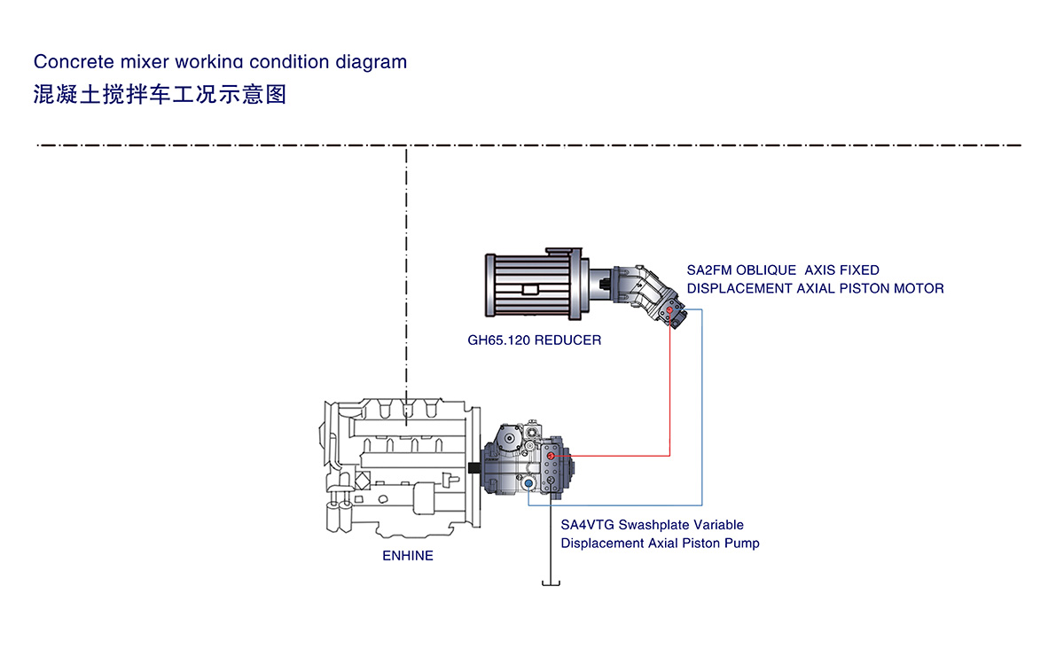 1、The SA4VTG series axial piston pump, driven by the engine, converts mechanical energy into hydraulic energy and transmits it to the SA2FM fixed displacement motor. The motor then drives the reducer, which in turn drives the mixing device to mix the concrete.