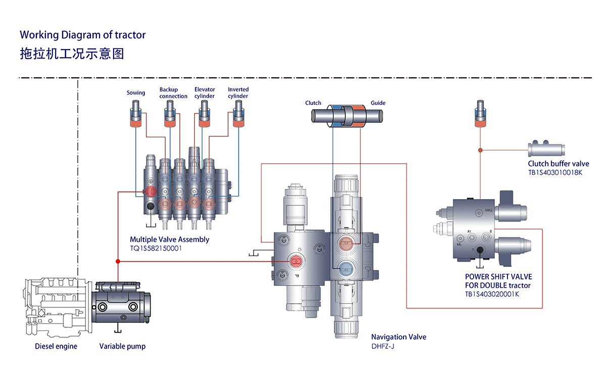 The complete load-sensitive electro-hydraulic proportional system for tractors, ranging from 70 to 220 horsepower, consists of a variable displacement piston pump, load-sensitive electro-hydraulic proportional multi-way valve, steering unit, electronic control handle, high-precision sensors, power shift, and controller.