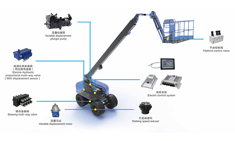 It realizes actions such as vehicle driving and steering, boom amplitude extension/retraction, platform rotation, and automatic leveling. It offers stepless speed control, smooth start/stop, rapid response, stable movements, and good micro-movement performance.