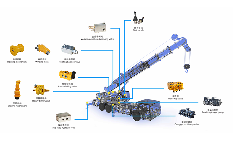Proportional pressure self-adaptive slewing multi-way valve. It allows different buffering strategies to be set according to different working conditions, loads, and speeds, achieving comprehensive buffering and providing good buffering effects during crane slewing startup and braking.