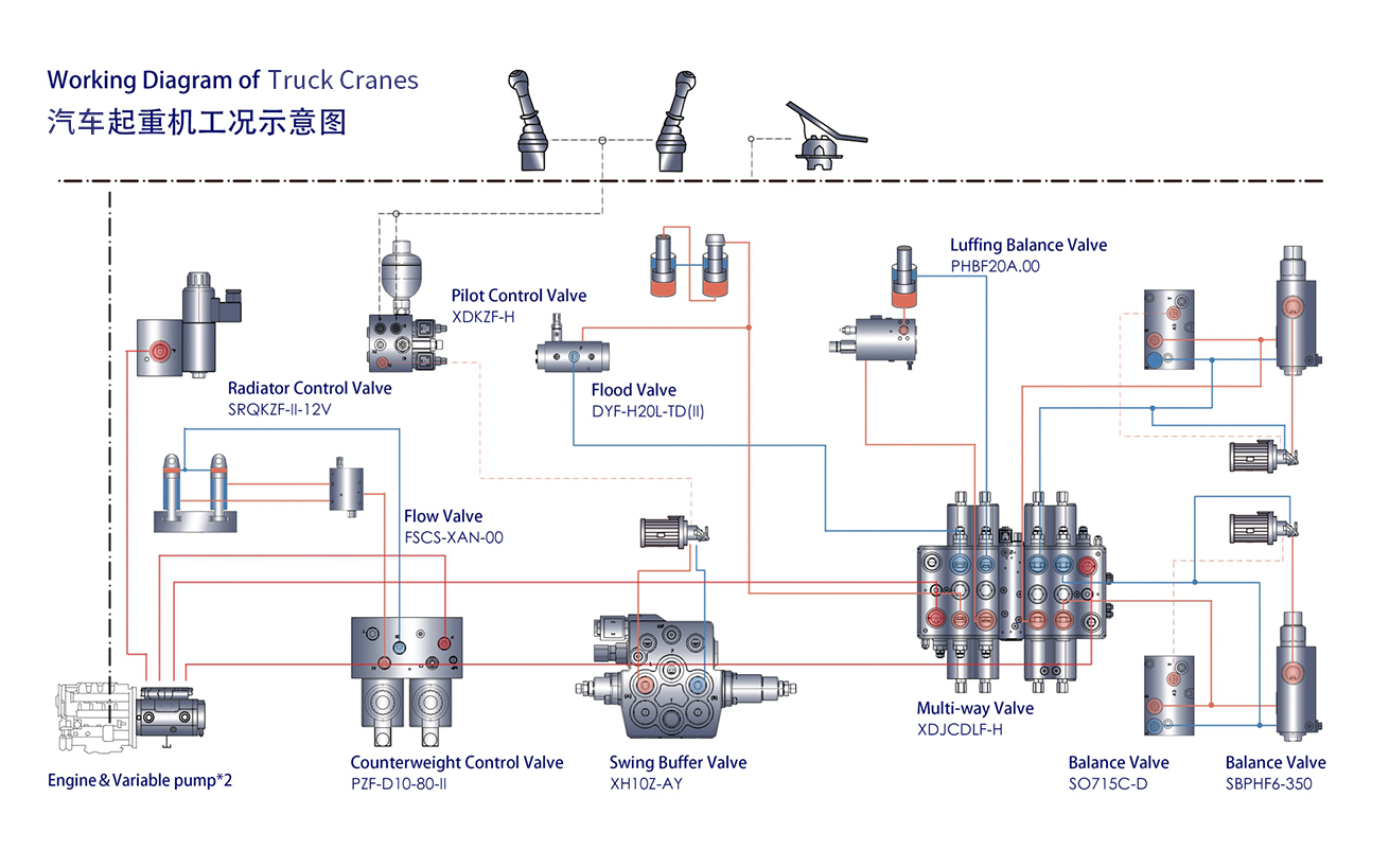 On-board multi-way valve with variable/fixed dual pump logic compound control and integrated electro-hydraulic system. This valve features high integration of electro-hydraulic components and logic compound control. It includes a compensating spool for the load pick-up check valve. The valve stem opening and closing circuit adopts a constant flow network matching, enabling flexible opening and closing of the main valve. Additionally, the valve can provide compensation pressure and flow to the small chamber of the variable amplitude cylinder, achieving dynamic compensation for the variable amplitude system.